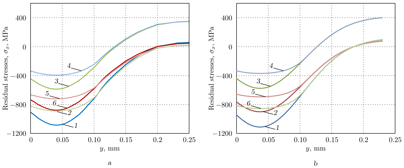 [Figure 5. The kinetic data for the components $\sigma _{x} $ under creep conditions at an angular rotation speed of 1500 RPM in the section $x = 75$ mm, obtained for a smooth sample using FEM (a) and the mesh method (b) [32]. Calculated values: 1 — after the hardening procedure at 20 °C at time $t = 0 - 0$; 2 — after temperature loading up to 650 °C at time $t = 0 + 0$; 3 — after force loading from rotation at 650 °C at time $t = 0 + 0$; 4 — after creep under temperature-force loading at 650 °C at time $t = 100 - 0$ h; 5 — after force unloading at 650 °C at time $t = 100 + 0$ h; 6 — after temperature unloading to 20 °C at time $t = 100 + 0$ h]