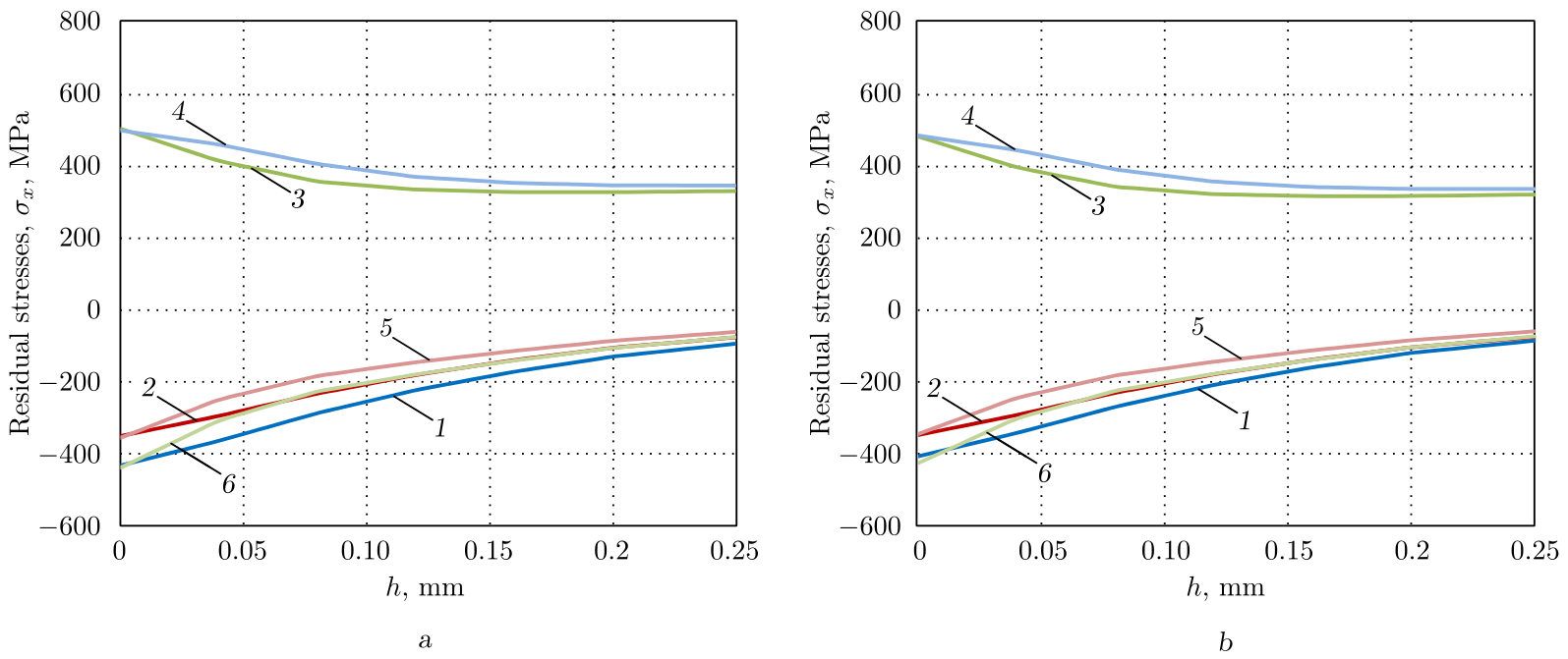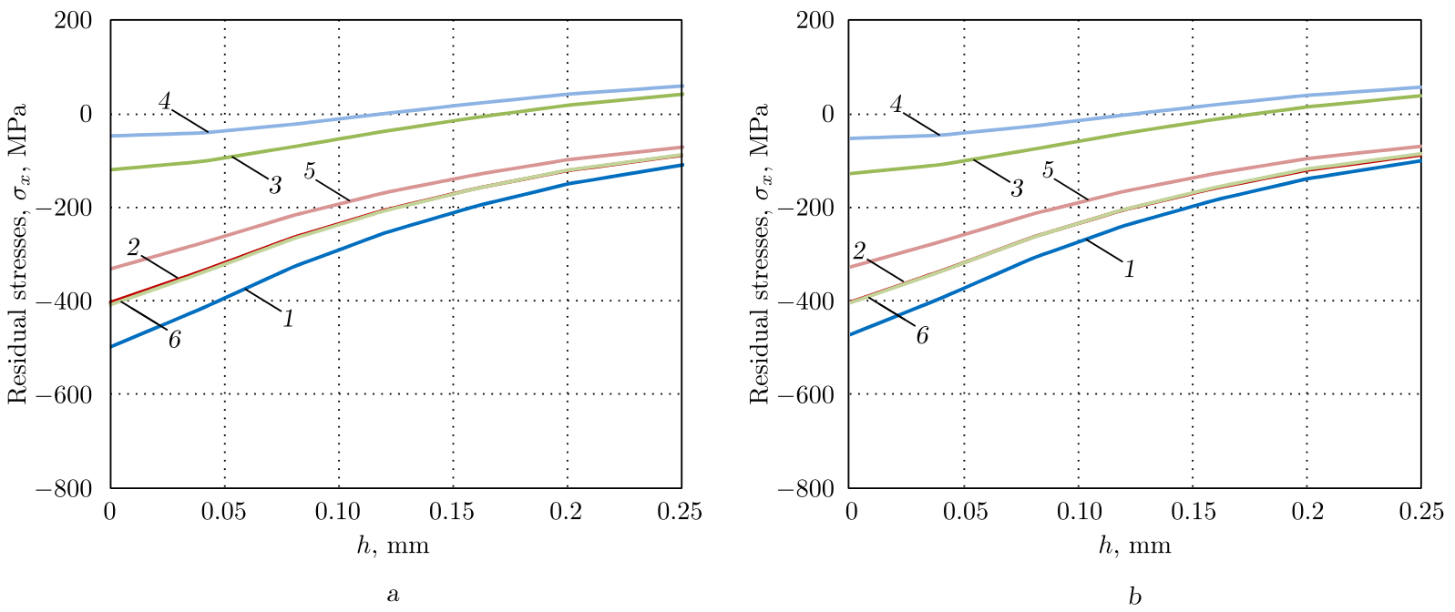 Из анализа представленных графиков кинетики компоненты $\sigma _{x} $ в поверхностно упрочненном образце с надрезом также видно, что несмотря на наличие надреза (концентратора напряжений) и возникающих вследствие вращения растягивающих напряжений, интенсивность которых доходит до 500 МПа (кривая 4 на рис. 13), при температурно-силовой разгрузке в наименьших поперечных сечениях изучаемого образца все еще наблюдаются сжимающие ОН. Интересный результат получен для распределения ОН при решении задачи в упругопластической постановке для $\rho=0.1$ мм (см. рис. 7–10 с меткой b). Здесь максимальное по модулю значение ОН после полного цикла «реконструкция ОН после ОППД при температуре 20 °C – температурно-силовая нагрузка – ползучесть в течение $t^*=100$ час при температуре 650 °C – температурно-силовая разгрузка» наблюдается не на дне концентратора ($h=0$), а на глубине $h\approx0.04$ мм. Кроме того, после полного цикла нагружения уровень ОН мало изменился, для этого достаточно сравнить кривые 1 и 6 на рис. 7–10 с меткой b. Аналогичная картина для релаксации остаточных напряжений наблюдается и при $\rho=0.3$ мм, для этого также достаточно сравнить кривые 1 и 6 на рис. 11–14 с меткой b.