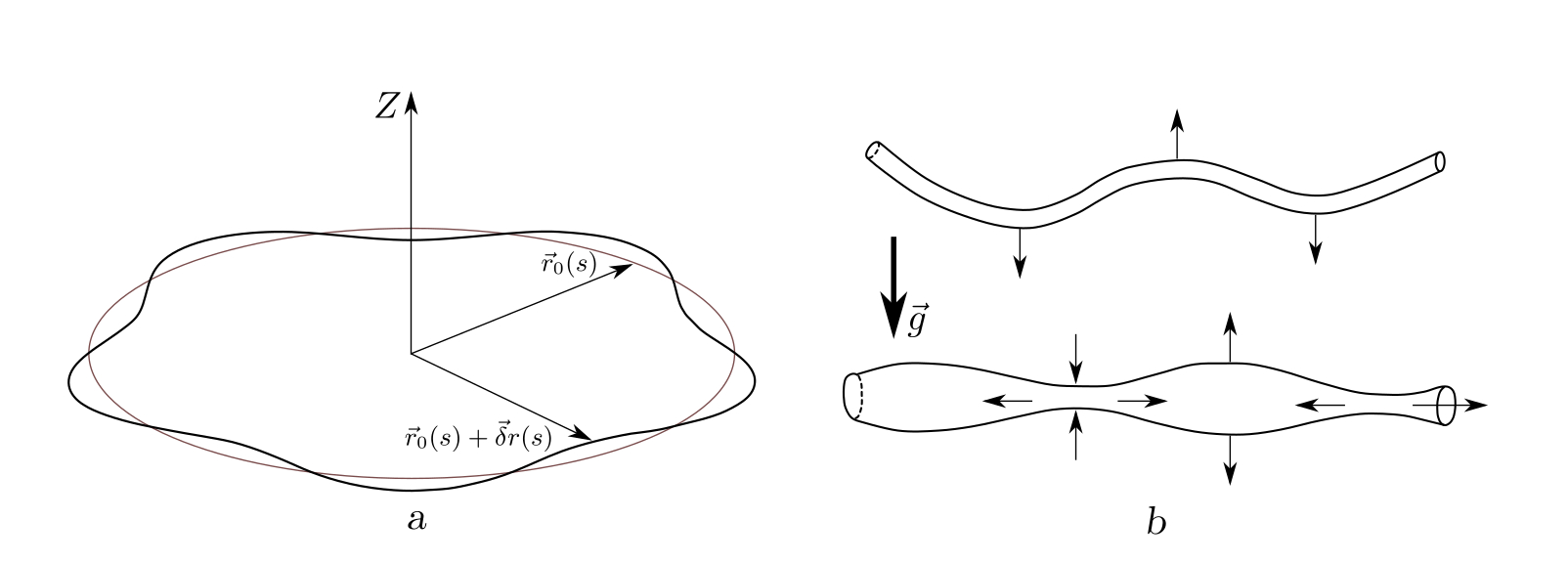 В начальный момент времени трубка расположена в экваториальной плоскости Солнца (рис. 2, a). Волновое число $m$ соответствует количеству стоячих волн вдоль периметра трубки. В равновесном состоянии выталкивающая сила Архимеда компенсируется натяжением магнитных силовых линий. Вблизи положения равновесия возникают два типа линейных колебаний: быстрые (альфвеновские) и медленные (варикозные) моды (рис. 2, b). В гравитационном поле Солнца наименее устойчивыми являются медленные моды колебаний. При малых значениях напряженности магнитного поля области с повышенной плотностью опускаются вниз, тогда как разреженные участки, теряя массу, под действием архимедовой силы ускоренно всплывают к фотосфере и в атмосферу Солнца. Данный механизм описывает развитие неустойчивости Паркера для медленных мод колебаний магнитного поля в конвективной зоне.
