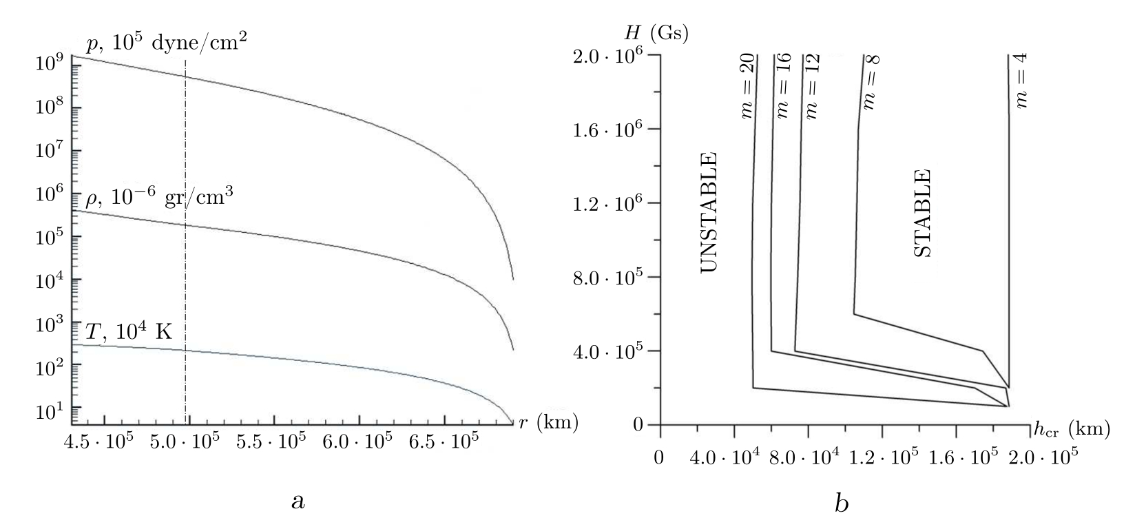 Рис. 3. Распределение газодинамических параметров в зависимости от глубины конвективной зоны [11] (a); распределение критических значений напряженности магнитного поля развития неустойчивости Паркера в зависимости от глубины конвективной зоны и волнового числа $m$ (b)