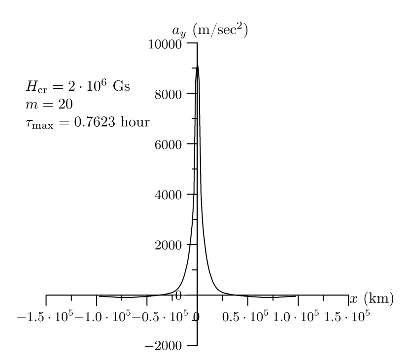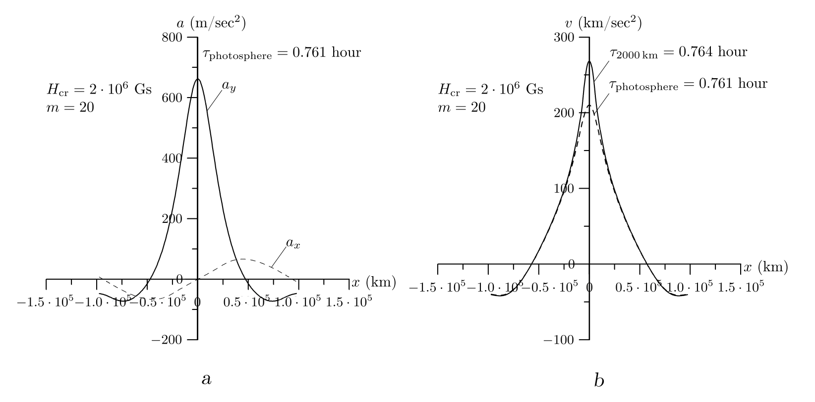 Основная стадия разгона магнитной трубки реализуется при подъеме в пределах хромосферы Солнца. В верхних слоях хромосферы реализуется взрывной режим развития неустойчивости Паркера. Максимальное значение вертикального ускорения достигает величины 8000 м/сек$^2$, что почти на два порядка превышает величину ускорения свободного падения на поверхности Солнца (рис. 5). Скорость подъема достигает значений около 300 км/с, что на порядок превышает значение местной скорости звука ($M\simeq 12$). Вершина всплывающей «иглы» резко заостряется: полуширина графика вертикального ускорения снижается от значения 20,000 км на фотосферном уровне до значений порядка $10^3$ км в верхних слоях хромосферы (рис. 5). Также на порядок понижается значение полуширины графика вертикальной скорости подъема по отношению к фотосферному уровню (рис. 4, b).