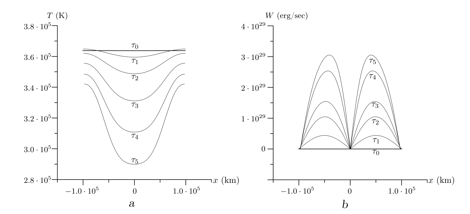 Рис. 6. Распределения температуры (a) и тепловых потоков (b) при подъеме магнитной трубки к фотосферному уровню: $\tau_0=0$, $\tau_1=32$ мин, $\tau_2=38$ мин, $\tau_3=42$ мин, $\tau_4=43$ мин, $\tau_5=44$ мин