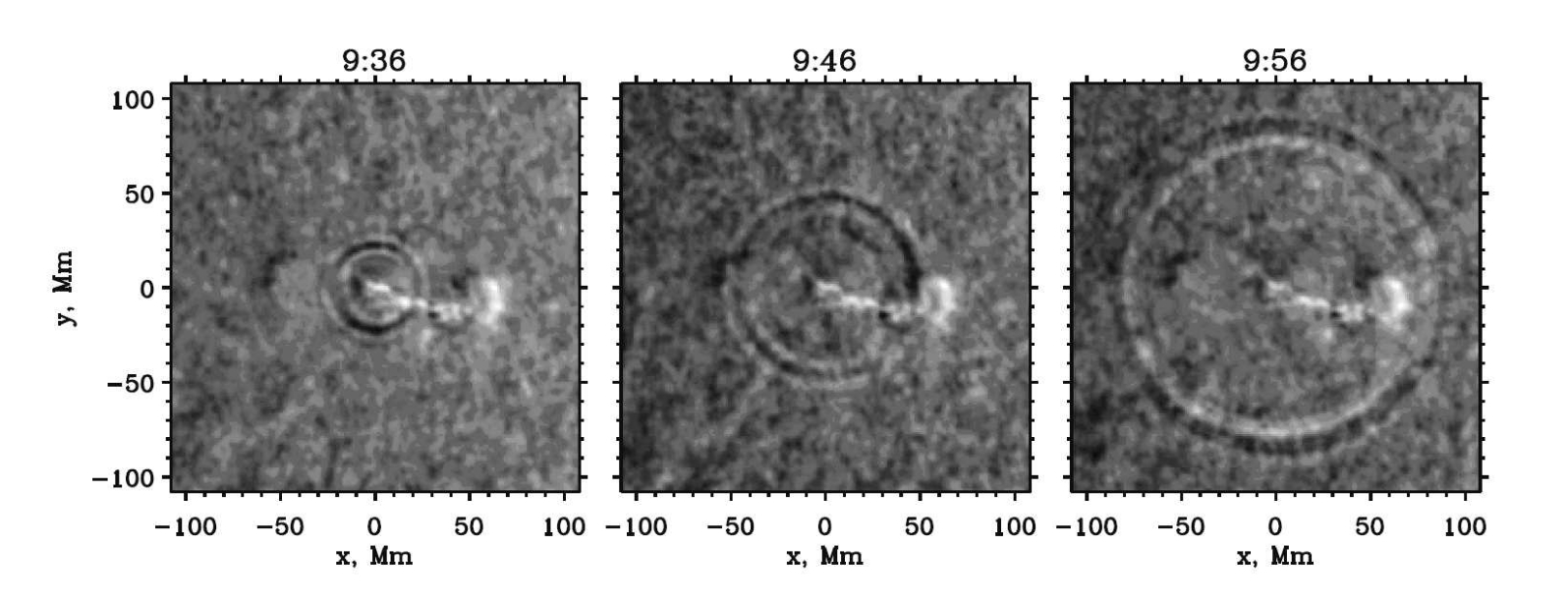 Рис. 7. Генерация концентрических ударных волн в солнечной хромосфере и на фотосферном уровне («солнцетрясение»)