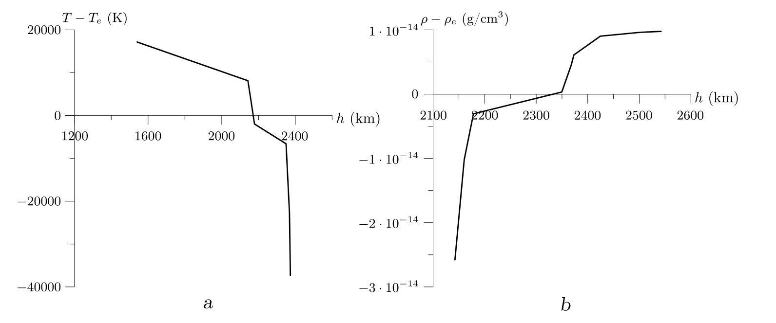 Рис. 8. Разность температур (a) и плотностей газа (b) внутри и снаружи магнитной трубки в верхних слоях хромосферы