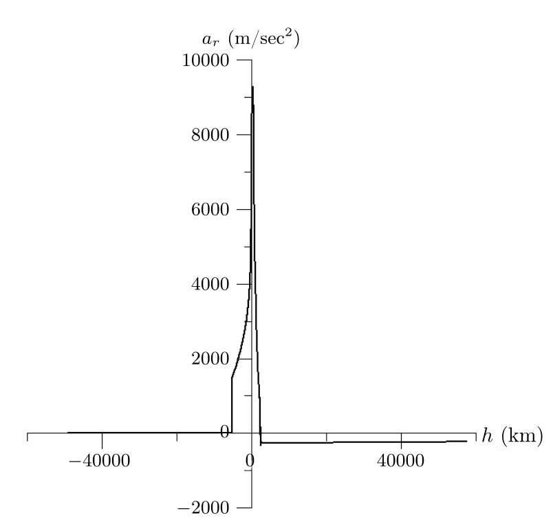 Рис. 9. Распределение вертикального ускорения верхней точки арочной магнитной структуры в зависимости от высоты подъема в солнечной атмосфере