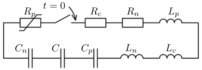 где $U_{H}$ — напряжение заряда конденсатора, В; $U_{O}$ — остаточное напряжение на конденсаторе после завершения разряда, В; $C_{\Sigma}$ — суммарная емкость разрядной цепи, Ф; $L_{\Sigma}$ — суммарная индуктивность разрядной цепи, Гн $\omega_{0}$ — резонансная частота разрядной цепи (RLC-контура), рад/с. Резонансная частота вычисляется по формуле \(\omega_{0} = 1/\sqrt{L_{\Sigma}C_{\Sigma}}\).