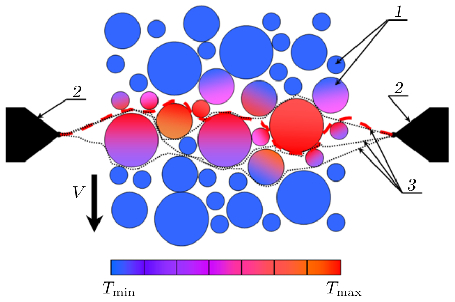 [Figure 2. Schematic representation of particle heating process by spark discharge: 1 — particles; 2 — electrodes; 3 — spark discharge trajectories;