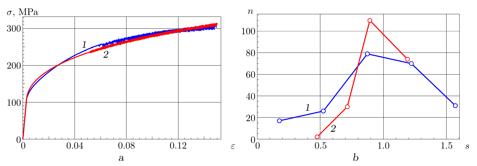 где $s$ — случайные нормированные модули скачков напряжений, а $f(\varepsilon)$ — детерминированная функция, зависящая от накопленной деформации $\varepsilon$ и характеризующая деформационное упрочнение материала. В качестве $f(\varepsilon)$ могут использоваться различные аппроксимации: линейная регрессия зависимости скачков напряжений от накопленной деформации (использована на рис. 1), сглаженная экспериментальная кривая напряженно-деформированного состояния и другие.