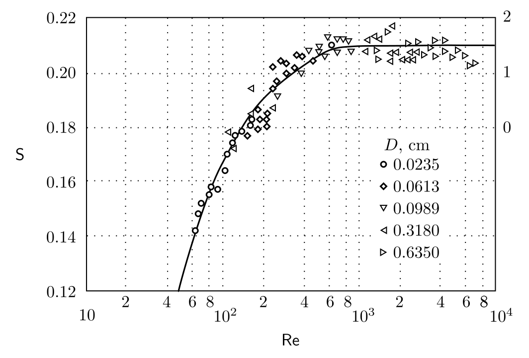 Число Струхаля S определяет частоту пульсации параметров скорости в вихревом следе при поперечном обтекании цилиндра:
