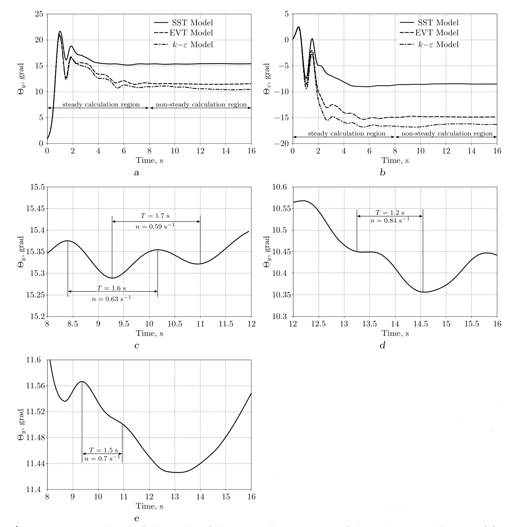 Рисунок 4. Зависимость угла вертикальной составляющей скорости от времени (a); зависимость угла поперечной составляющей скорости от времени (b); зависимость угла вертикальной составляющей скорости от времени при использовании модели турбулентности SST (c); зависимость угла вертикальной составляющей скорости от времени при использовании модели турбулентности k−ε (d); зависимость угла вертикальной составляющей скорости от времени при использовании модели турбулентности EVT (e)
