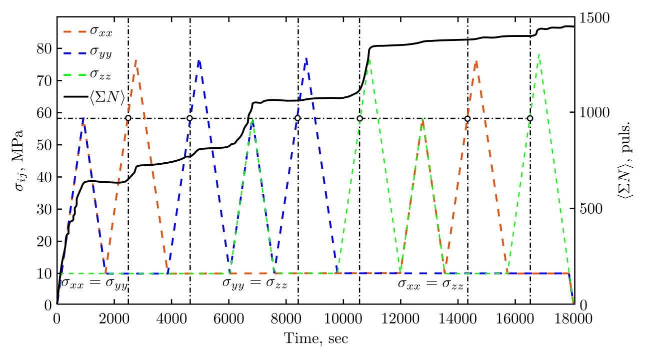 В пионерских работах [26, 27] впервые были представлены результаты исследования эффекта Кайзера при истинном трехосном нагружении с вращением эллипсоида главных напряжений (эллипсоида Ламе). Было показано, что эффект Кайзера является эффектом памяти поврежденности, при этом его проявление зависит от взаимной ориентации ансамбля трещиноватости и приложенных напряжений. В экспериментах на истинное и традиционное трехосное нагружение была продемонстрирована возможность избирательного повторного инициирования ортогонально ориентированных ансамблей микротрещин. При этом вопрос о том, какие параметры напряженно-деформированного состояния, за исключением ориентации и величины максимального сжимающего напряжения, контролируют эффект памяти материала, остается открытым.