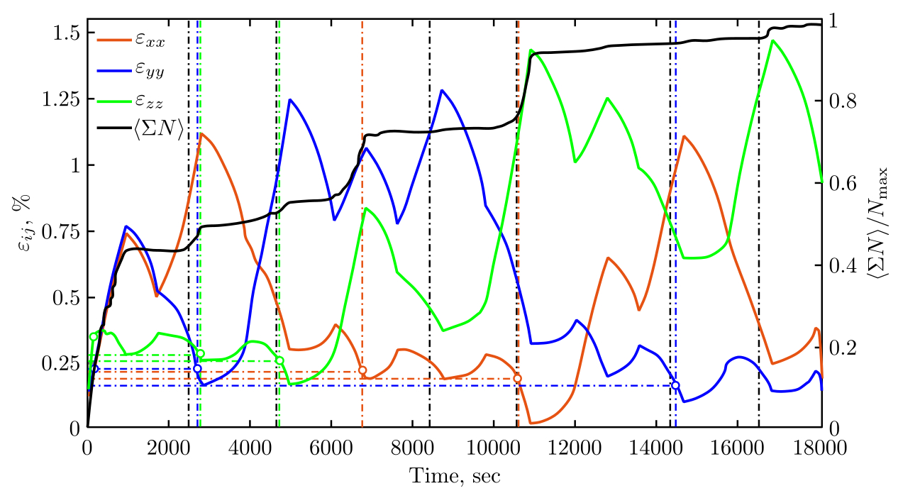Для определения причин избирательного проявления эффекта памяти был проведен анализ деформированного состояния образца песчаника и определены осевые деформации , и в трех взаимно ортогональных направлениях , и , вдоль которых осуществляется «активное непропорциональное нагружение – разгрузка». На рис. 2 представлены совмещенные траектория деформирования и зависимость относительного среднего суммарного счета АЭ от времени ( — максимальное количество сигналов АЭ, зарегистрированных во время проведения эксперимента). Деформации , и образца, соответствующие окончанию этапа всестороннего сжатия, принимались за реперные отсчетные величины. Далее от цикла к циклу определялись приращения , и относительного сжатия по каждому из направлений. Так, во втором цикле первого блока и меньше соответствующих реперных значений. Это может быть объяснено увеличением деформации относительного сжатия в этих направлениях. В каждом случае фиксировался момент времени превышения предыдущего уровня относительных деформаций сжатия и амплитуда приращения в абсолютных единицах. Если в рассматриваемом цикле превышение не наблюдалось ни по одному из трех направлений, приращение принималось равным нулю и относилось либо к моменту окончания этапа активного нагружения, либо к моменту окончания разгрузки.