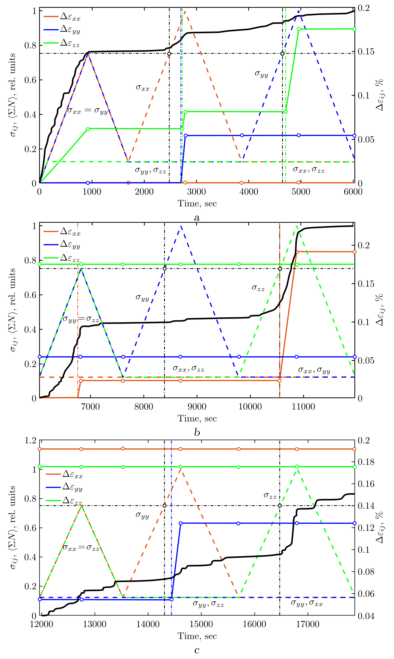 3.1. Циклы 1–3 (рис. 3, a). Во втором цикле рост не сопровождается АЭ активностью вплоть до напряжения, соответствующего максимальному напряжению первого цикла. При этом момент превышения напряжения предыдущего уровня (отмечен черной точкой) не сопровождается ростом деформации относительного сжатия в направлениях, по которым напряжение поддерживается постоянным. Рост и наблюдается спустя 230 сек. и сопровождается увеличением активности АЭ, изменением наклона на кривой суммарного счета. В третьем цикле момент превышения напряжения первого цикла и начало роста совпадают (см. рис. 3, a) и сопровождаются слабовыраженным изменением наклона кривой суммарного счета при существенном увеличении .