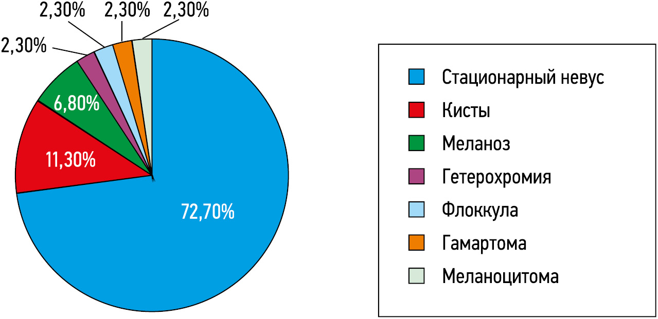 Проведён ретроспективный и проспективный анализ новообразований радужки у пациентов молодого возраста по данным детского поликлинического отдела и отдела офтальмоонкологии и радиологии НМИЦ глазных болезней им. Гельмгольца с января 2018 по апрель 2022 г. За данный период времени в поликлинический отдел обратилось 44 ребёнка с подозрением на новообразование радужки (20 мальчиков и 24 девочки) в возрасте от 6 месяцев до 17 лет (9,1±5 лет). Из 44 образований радужки стационарный невус встречался у 32 (72,7%) пациентов, меланоз радужки отмечен у 3 (6,8%) детей, выявлено также 5 (11,3%) кист, одна (2,3%) гетерохромия, одна (2,3%) флоккула, одна (2,3%) гамартома, одна (2,3%) меланоцитома (рис. 1).