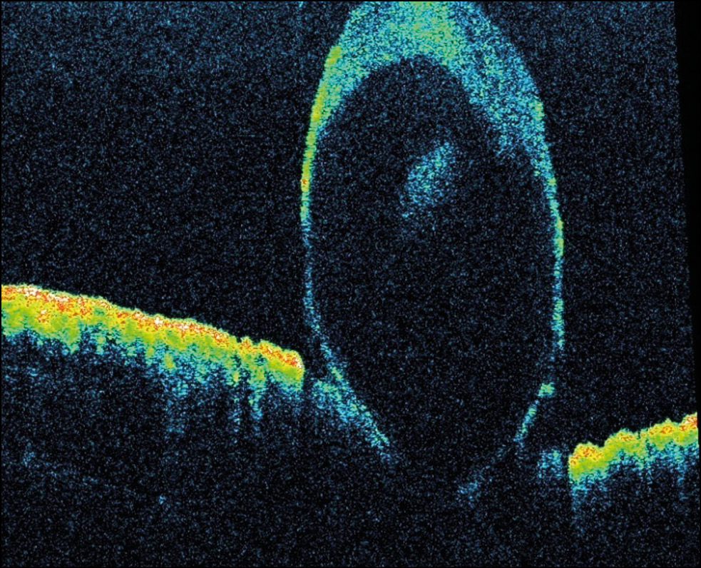 Рис. 3. Оптическая когерентная томография радужки OS. Кистовидное образование с гиперрефлективной капсулой и гипорефлективным содержимым.