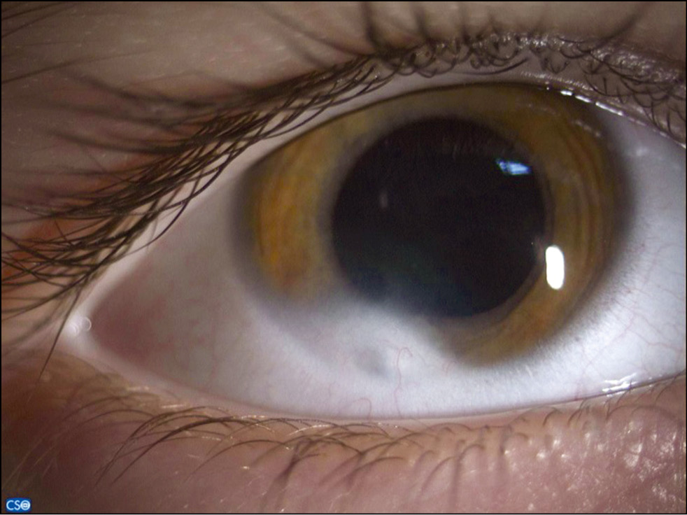На основании клинической картины и инструментальных методов исследования установлен следующий диагноз: врождённый порок развития в виде кисты радужки и роговицы, вторичные изменения эндотелия роговицы, передняя синехия, начальные помутнения в нижне- наружном квадранте хрусталика правого глаза. Острота зрения OS после операции составила 0,6. Учитывая отсутствие признаков воспаления, возраст, высокий риск послеоперационных осложнений после иридэктомии со сквозной кератопластикой и иссечении трети радужки, рекомендовано динамическое наблюдение.