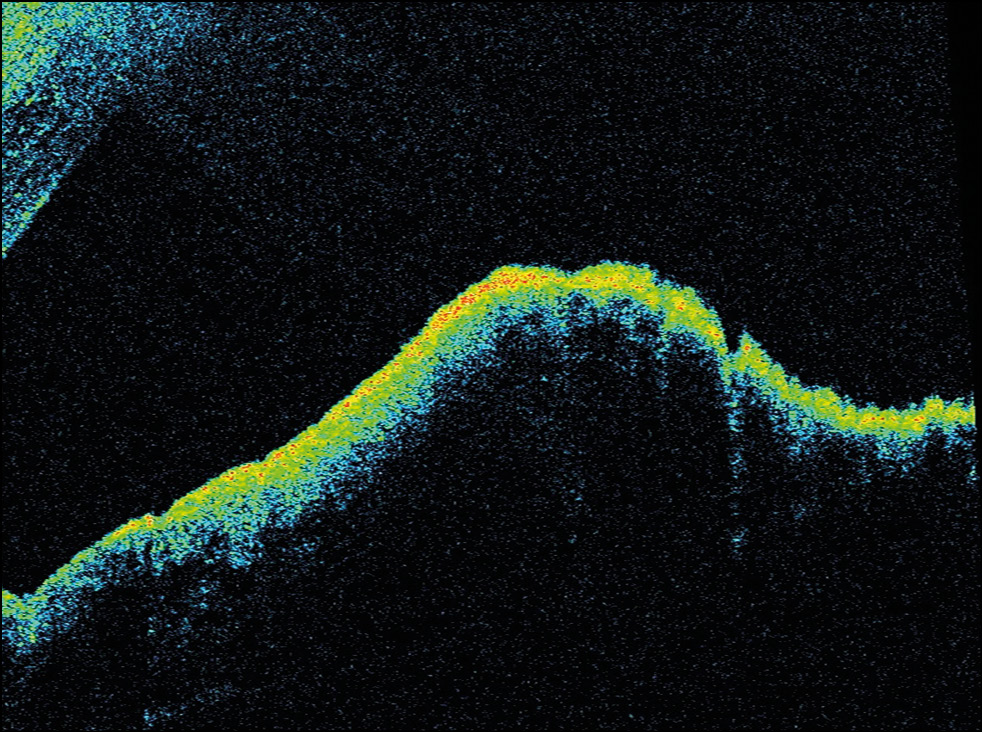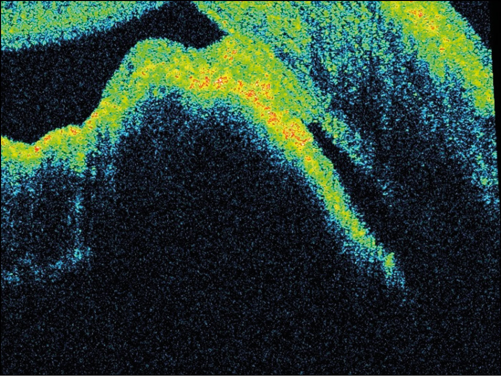 Рис. 8. Оптическая когерентная томография радужки OD. Гиперрефлективная поверхность образования.
