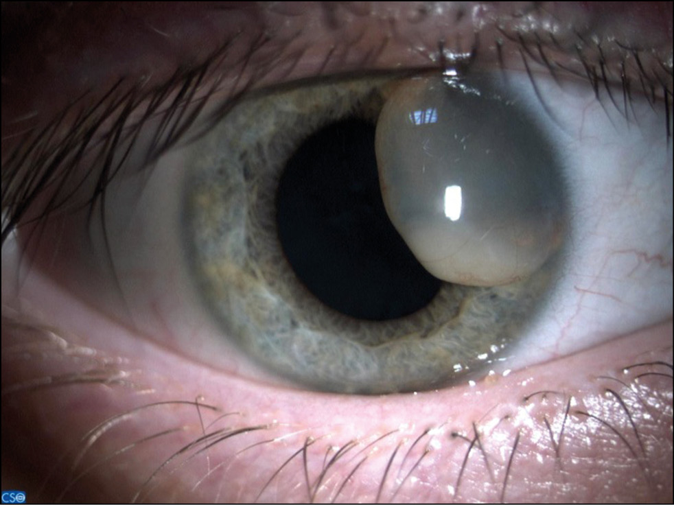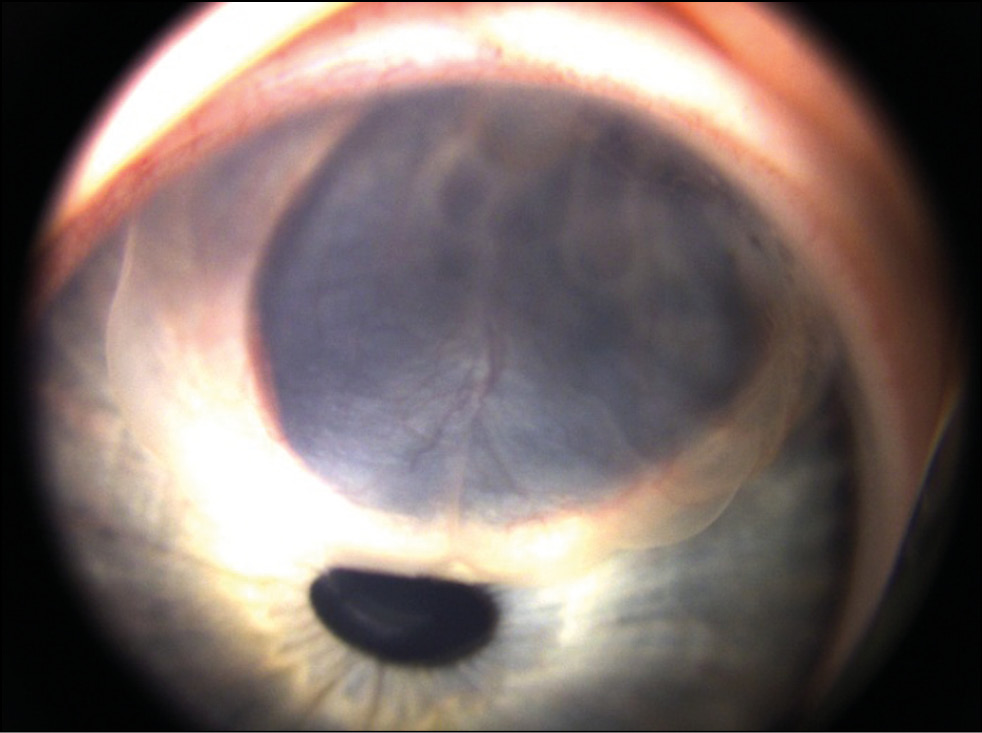 Рис. 4. Беспигментное образование бульбарной конъюнктивы с переходом на роговицу.