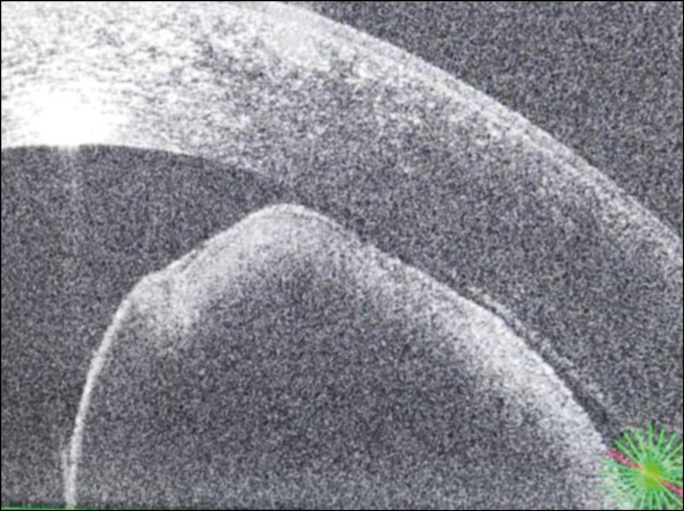 Рис. 11. Оптическая когерентная томография радужки OD. Гиперрефлективная поверхность капсулы кисты радужки.