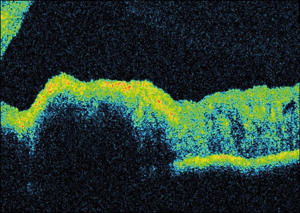 По данным оптической когерентной томографии правого глаза отмечена гиперрефлективная поверхность образования с эффектом «тени» подлежащих структур (рис. 8).