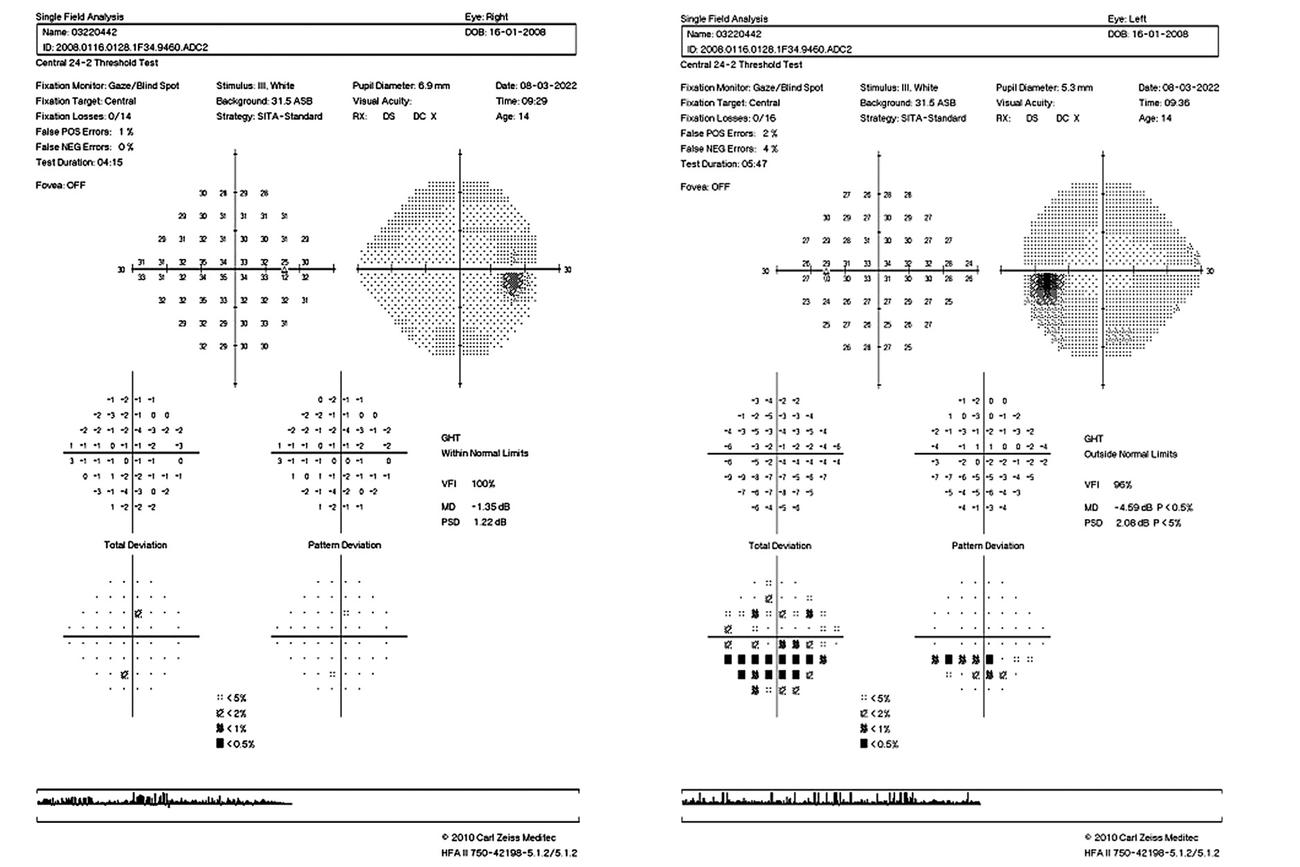 При проведении компьютерной периметрии на левом глазу выявлены изменения полей зрения, характерные для глаукомы (рис. 1).
