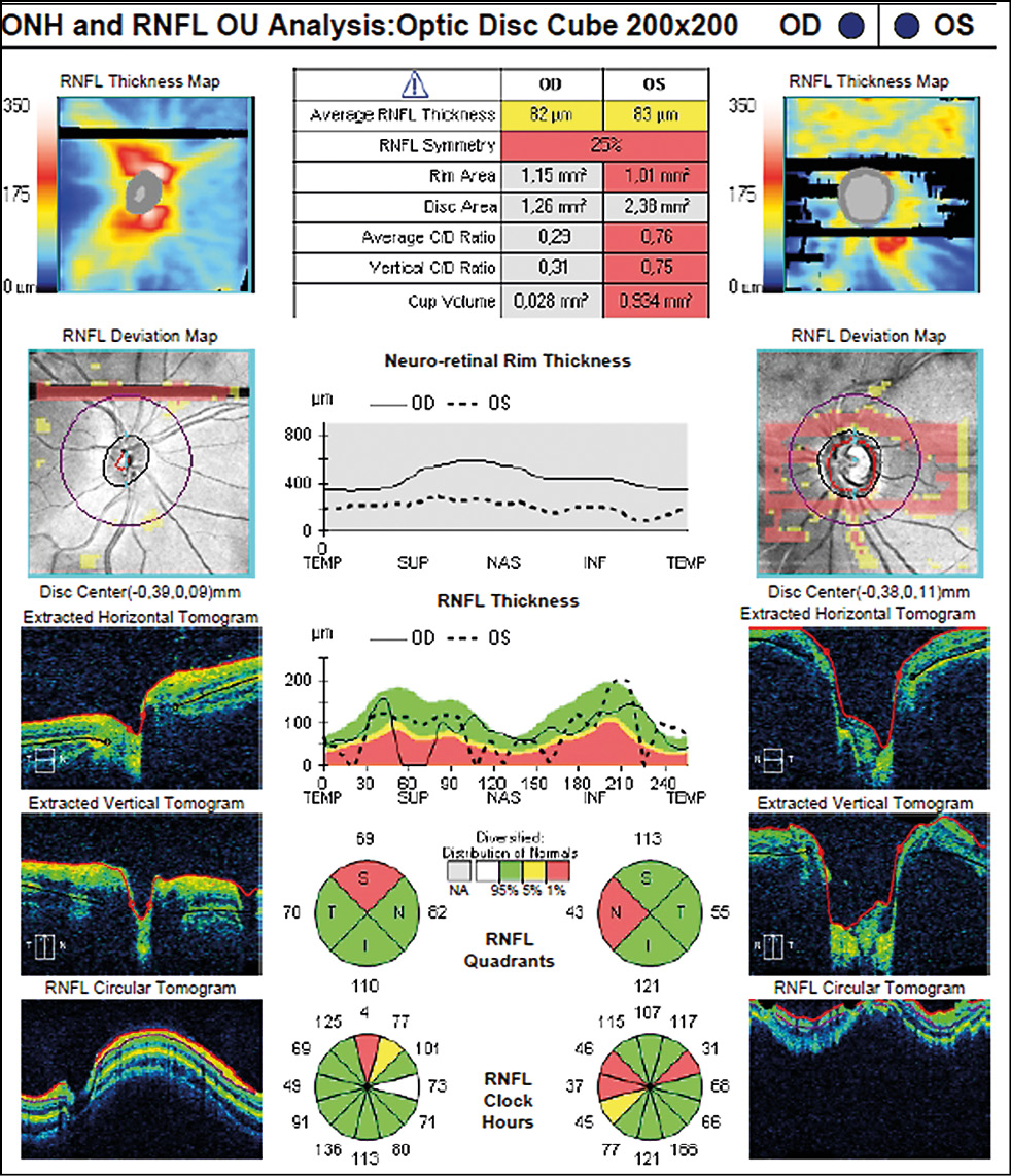 При выполнении оптической когерентной томографии (ОКТ) дисков зрительного нерва (рис. 2) обращает на себя внимание аномальная форма диска зрительного нерва (ДЗН), а именно: большая экскавация, не соответствующая тяжести глаукоматозного процесса, а также избыток фиброзной ткани в глубине экскавации ДЗН.