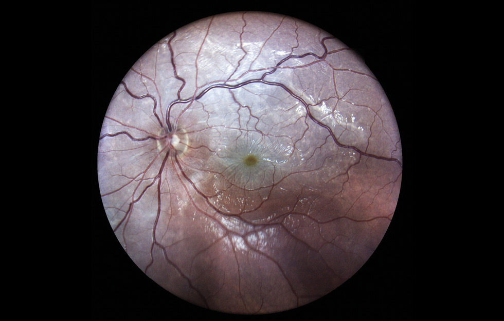 При поступлении в клинику у больного максимально корригированная острота зрения (МКОЗ) обоих глаз (OU) -1.0. При визуальном осмотре левого глаза наблюдалась передняя камера средней глубины, угол был частично закрыт, трабекулы прослеживались не во всех отделах, влага прозрачная. Хрусталик и стекловидное тело были прозрачны. На глазном дне был виден диск зрительного нерва с чёткими контурами, бледно-розовый, слегка монотонный. Экскавация диска зрительного нерва (ЭД) составляло 5-6:10. Соотношение артерий к венам — 1:2. Артерии сужены. Макулярный рефлекс чёткий. На периферии наблюдается субретинальный фиброз в наружных отделах и микрососудистые аномалии.