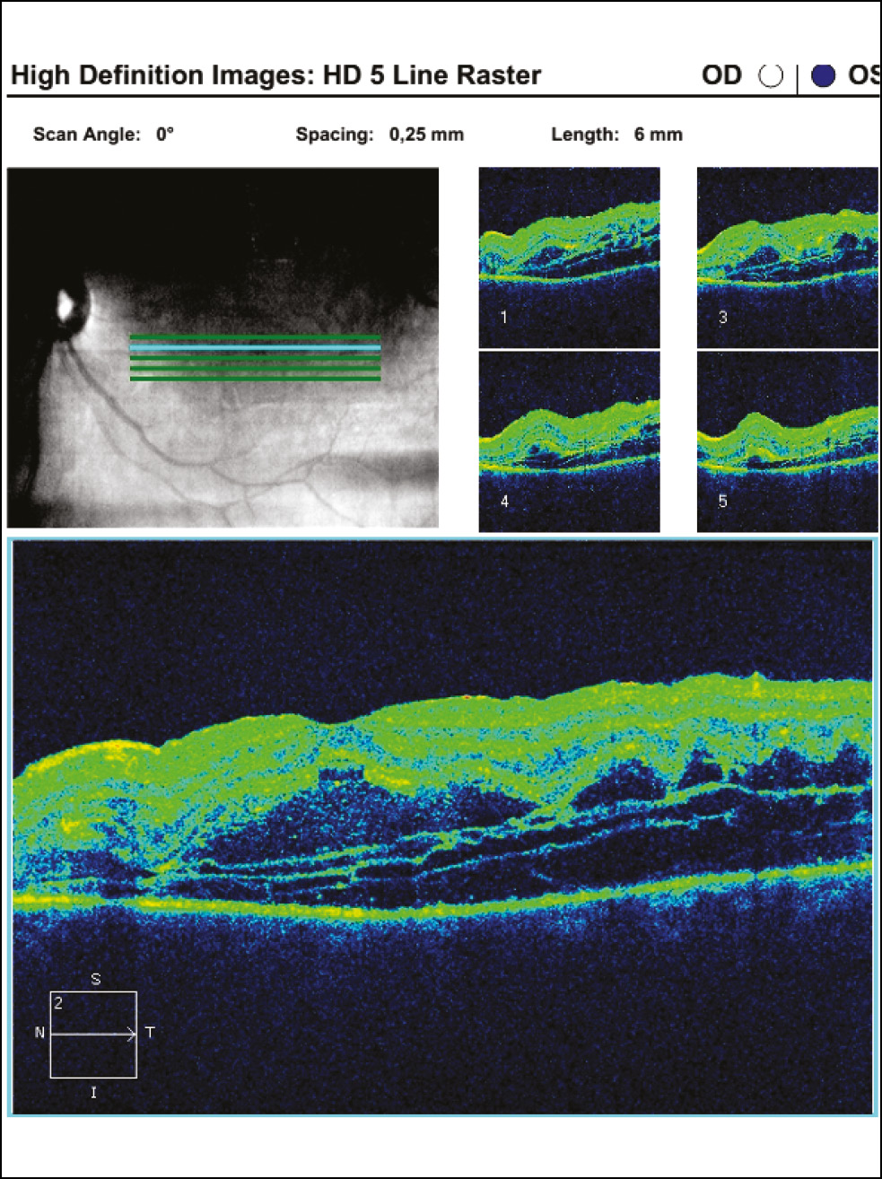 При осмотре глазного дна видны пузыри ЦХО в верхне-наружном и в нижне-внутреннем отделах, а также отмечается тотальная эксудативная отслойка сетчатки и ретиношизис во всех отделах кроме нижне-наружного (рис 5). Разрывов, тракций сетчатки на глазном дне нет. По результатам ОКТ определяется высокая отслойка сетчатки с ретиношизисом (рис 6).