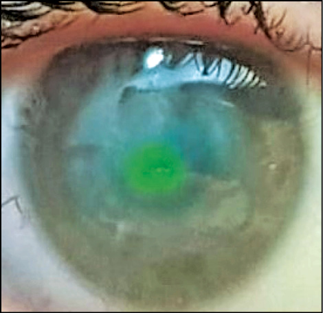 Рис. 4. Язва роговицы персистирующая, с окраской флуоресцеином на 21-й день лечения.