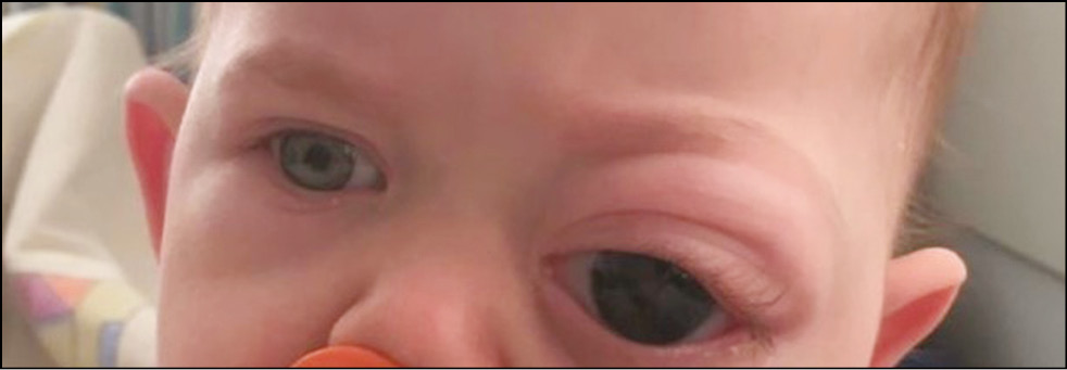 В июне 2020 г., когда ребёнку исполнился один месяц, обратились в Детское консультативно-поликлиническое отделение (ДКПО) НМИЦ глазных болезней имени Гельмгольца, был поставлен диагноз ОS «врождённая глаукома». В возрасте ребёнка 5 месяцев передне-задняя ось глаза (ПЗО) составляла: ОD 19,5 мм, ОS 27,4 мм. Острота зрения ОS светоощущение. При биомикроскопии на OS выявлено центральное помутнение роговицы, диаметр роговицы равен 15,5 мм, лимб растянут до 5 мм. Внутриглазное давление (ВГД) ОD/ОS составляет 19/30 мм рт ст. В возрасте 1,5 и 5 месяцев жизни ребёнка в связи с некомпенсацией ВГД OS проведена синустрабекулэктомия, операция прошла без осложнений. В возрасте трёх месяцев появились пятна цвета «кофе с молоком», заподозрен нейрофиброматоз. Обследование не проводилось. Когда ребёнку исполнилось 7 месяцев, мама отметила резкое увеличение ОS в размере. Ребёнок был направлен в ФГБУ «НМИЦ глазных болезней им. Гельмгольца» с некомпенсацией ВГД, где находился на стационарном лечении в детском хирургическом отделении в январе 2021 г. Выявлен экзофтальм со смещением глаза кнаружи и книзу, центральное помутнение роговицы, её диаметр на момент осмотра составил 15,5 мм, лимб растянут до 5–6 мм. При осмотре определялась средняя равномерная передняя камера. Из-за помутнения роговицы проведение гониоскопии, а также визуализация глубжележащих структур была затруднена. ПЗО OD/OS составили 19,6/27,4 мм. ВГД ОD/ОS 22/43 мм рт ст.