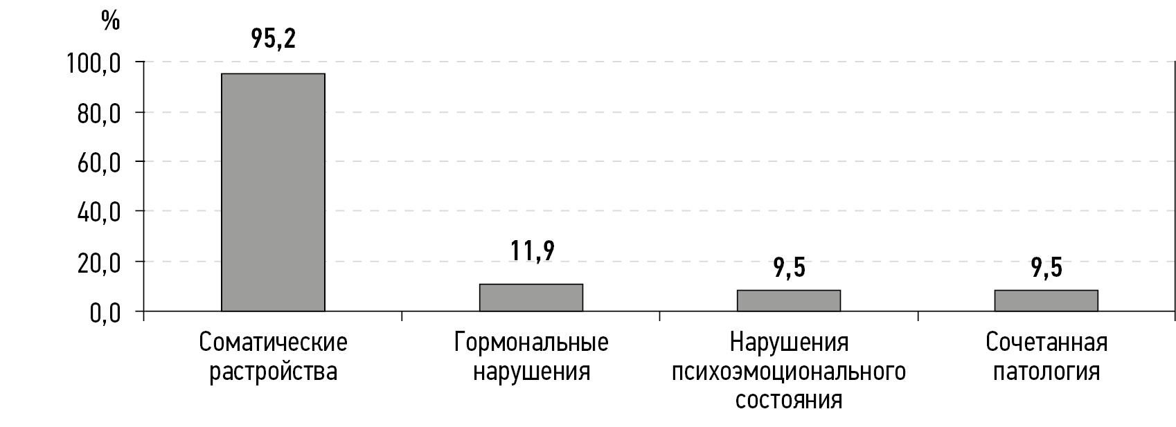 Из 88 больных старше 18 лет группы II хронические состояния выявлены у 42 (47,7%). Соматические расстройства выявлены в 95,2% случаев, гормональные нарушения — в 11,9%, нарушения психо-эмоционального состояния — в 9,5%, сочетанная патология — в 9,5% случаев (рис.).