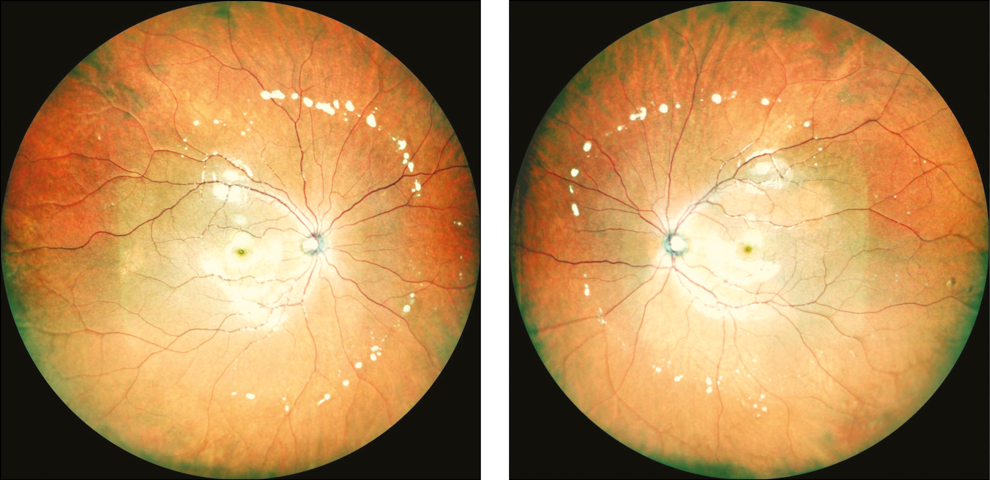 При офтальмоскопии на глазном дне выявлены преретинальные отложения молочно-белого цвета, размером около 0,2 диаметра ДЗН, расположенные на средней периферии, концентрично макуле, более выражено с носовой стороны (рис. 1).