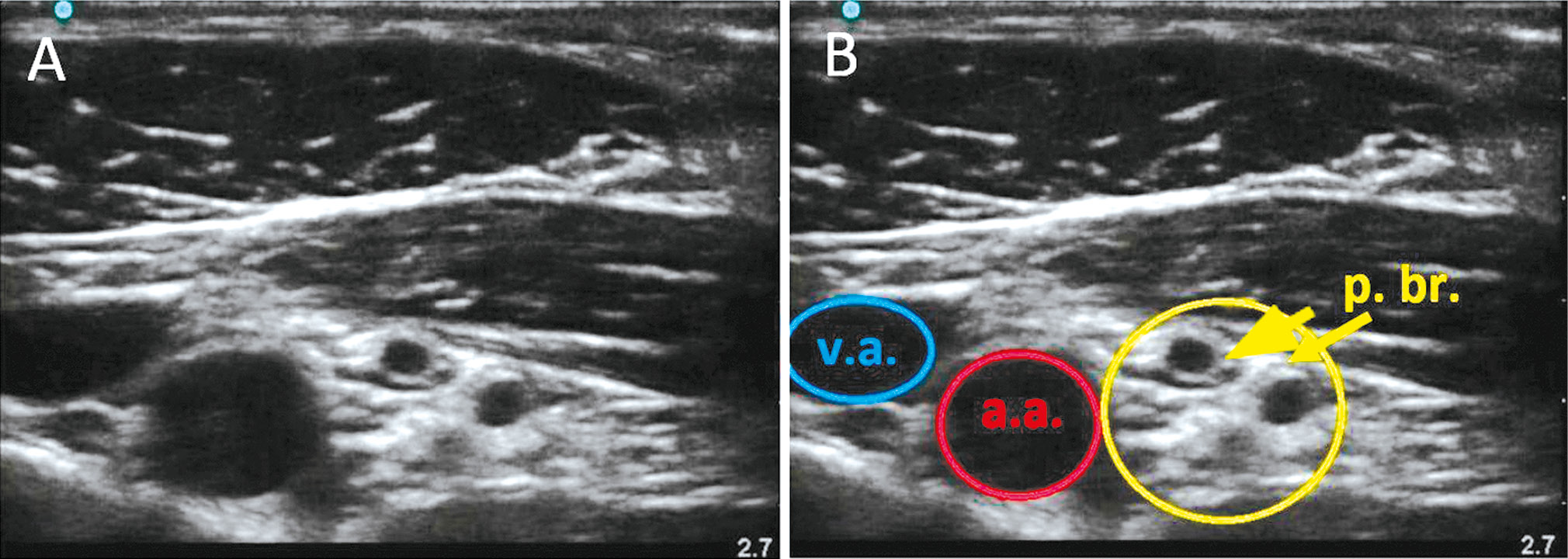 Рис. 1. Сонограмма сосудисто-нервного пучка, полученная по методике модифицированного проксимального подключичного доступа. А – ультразвуковое изображение. В – ультразвуковая картина и схема сосудисто-нервного пучка в подключичной области (v.a. – подмышечная вена, а.а. – подмышечная артерия, p.br. – плечевое сплетение) / Fig. 1. Sonogram of the neurovascular bundle obtained using the modified proximal subclavian approach. A – ultrasound image. B – ultrasound picture and diagram of the neurovascular bundle in the subclavian region (v.a. – axillary vein, a.a. – axillary artery, p.br. – brachial plexus)