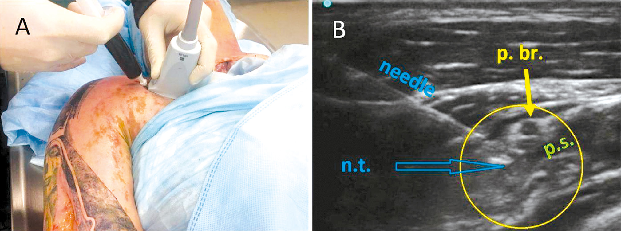 Рис. 2. Выполнение блокады по модифицированной методике проксимального подключичного доступа к плечевому сплетению с использованием ультразвуковой навигации. А. Положение датчика и иглы во время выполнения блокады. В. Схема визуализации кончика иглы и пучков плечевого сплетения, окружённых раствором (p.br. – плечевое сплетение, needle – игла, n.t. – кончик иглы, p.s. – окрашенный раствор) / Fig. 2. Blockade performed using a modified technique of proximal subclavian access to the brachial plexus using ultrasound navigation. A. Position of the transducer and needle during the blockade. B. Schematic of visualization of the needle tip and bundles of the brachial plexus surrounded by solution (p.br. – brachial plexus, needle – needle, n.t. – needle tip, p.s. – colored solution)