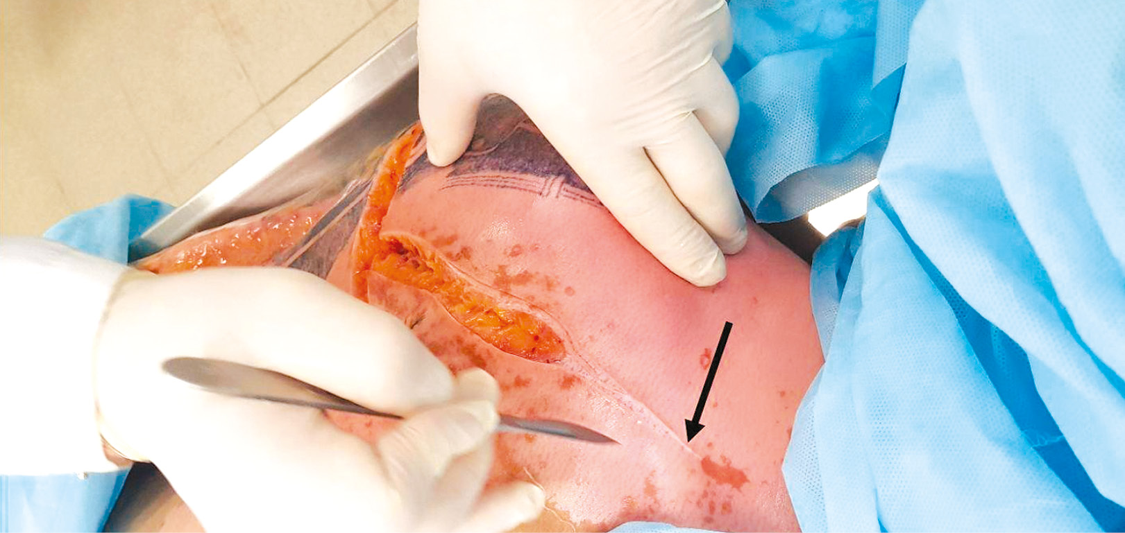Рис. 3. Разрез кожи от ключицы вдоль переднего края дельтовидной мышцы до границы верхней и средней трети плеча. Стрелкой показана середина ключицы / Fig. 3. Skin incision from the clavicle along the anterior edge of the deltoid muscle to the border of the upper and middle third of the shoulder. The arrow shows the middle of the clavicle