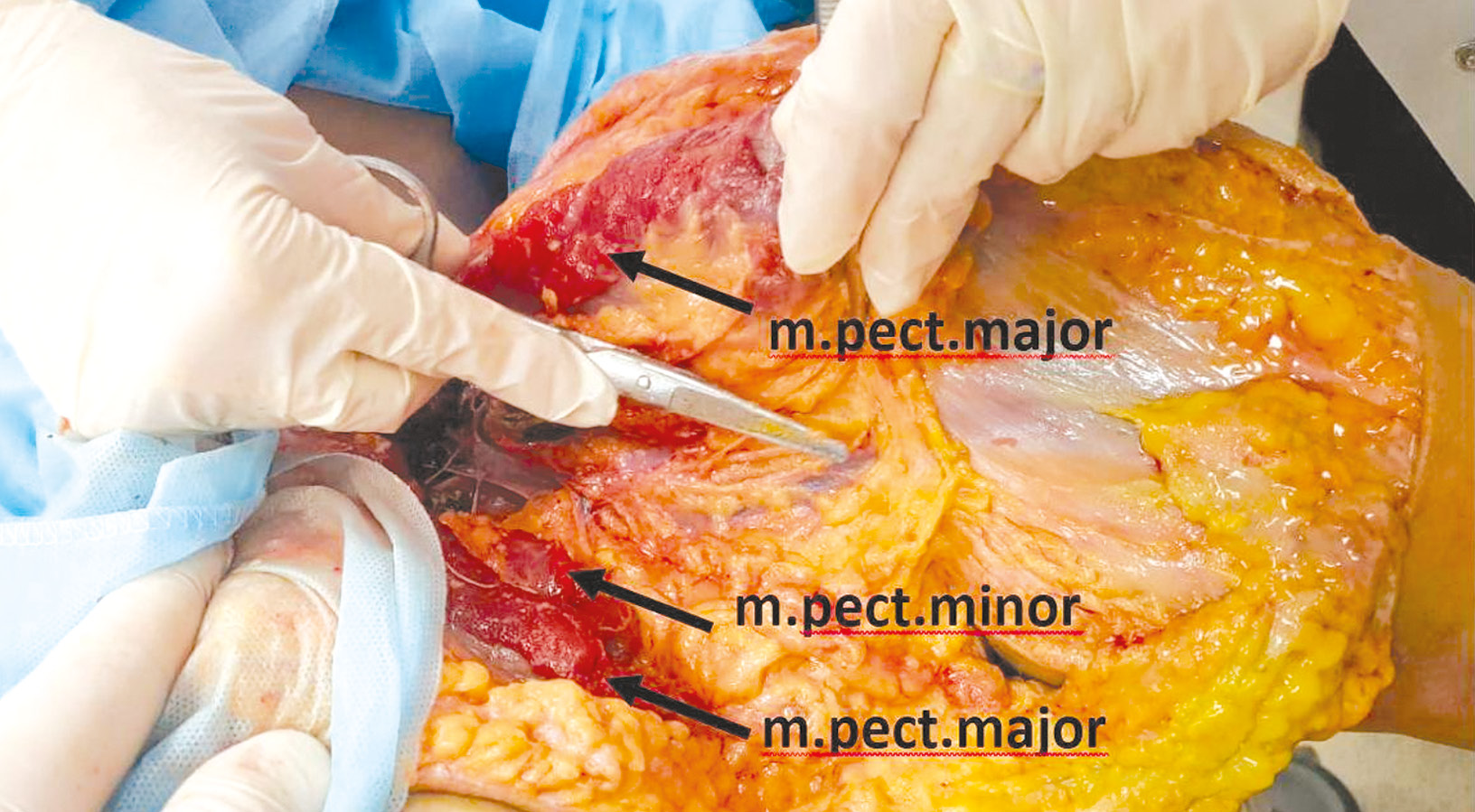 Рис. 4. Послойное рассечение тканей для обнажения сосудисто-нервного пучка (m.pect.major – б.г.м. – большая грудная мышца, m.pect.minor – м.г.м. – малая грудная мышца) / Fig. 4. Layered tissue dissection to expose the neurovascular bundle (m.pect.major – pectoralis major muscle, m.pect.minor – pectoralis minor muscle)
