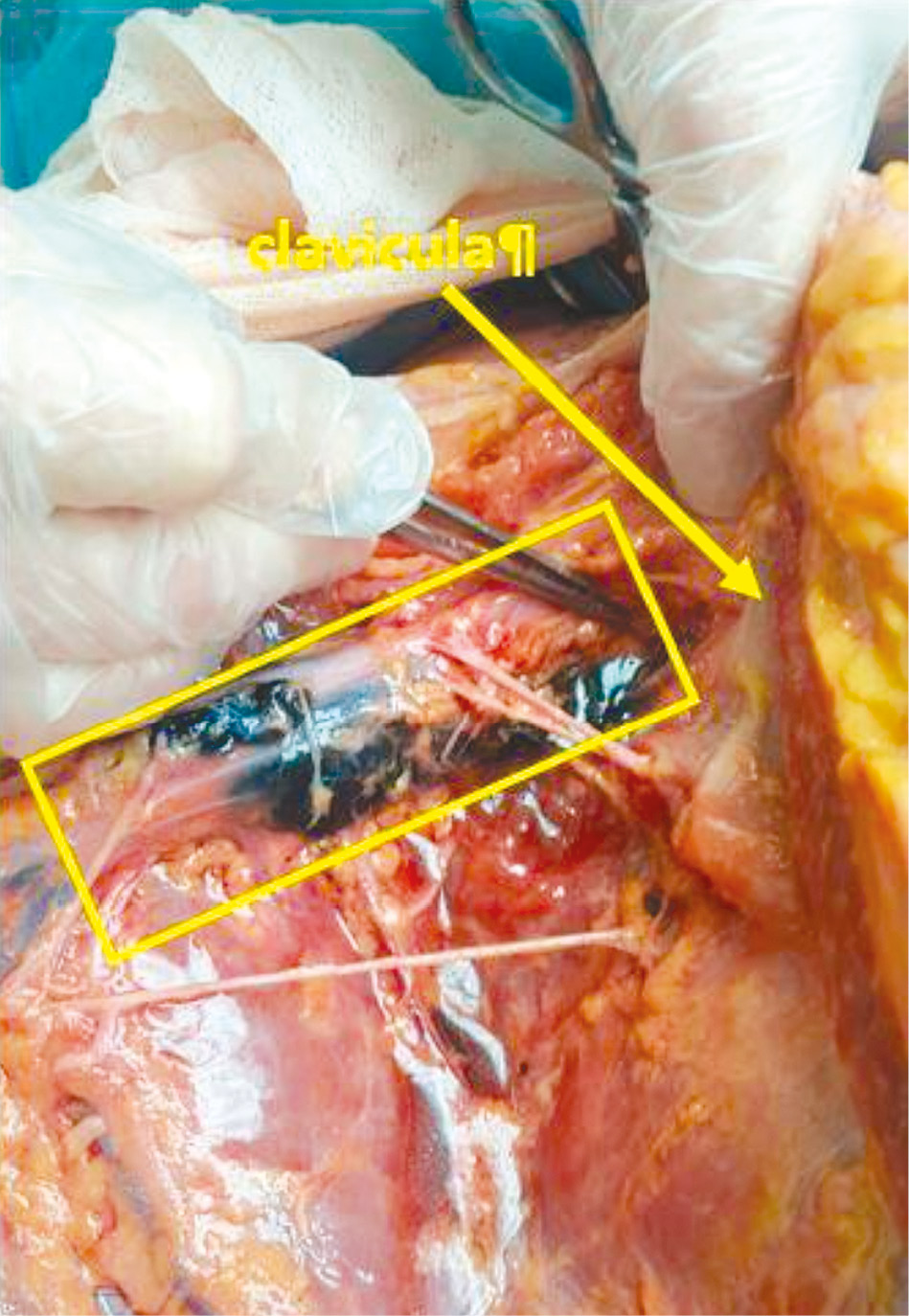 Малая грудная мышца была рассечена на 0,5 см дистальнее её прикрепления к клювовидному отростку и так же отведена. Подключичная мышца была разрезана и отведена, чтобы визуализировать сосудисто-нервный пучок (СНП). После визуализации СНП в фасциальном футляре оценивались границы распределения чернил по отношению к пучкам и конечным ветвям плечевого сплетения от пресечения ими верхнего края ключицы и до верхних отделов подмышечной области (рис. 5).