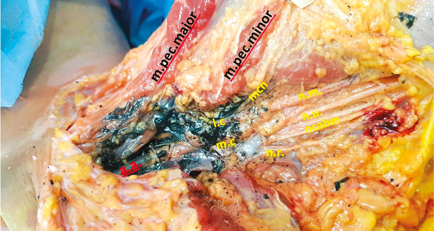Рис. 6. Вскрытый футляр сосудисто-нервного пучка (a.a. – подмышечная артерия, l.c. – латеральный пучок, m.c. – медиальный пучок, n.r. – лучевой нерв, mcn – мышечно-кожный нерв, n.m. – срединный нерв, n.u. – локтевой нерв, ncabm – медиальный кожный нерв предплечья) / Fig. 6. Opened case of the neurovascular bundle (a.a. – axillary artery, l.c. – lateral bundle, m.c. – medial bundle, n.r. – radial nerve, mcn – musculocutaneous nerve, n.m. – median nerve, n.u. – ulnar nerve, ncabm - medial cutaneous nerve of the forearm)
