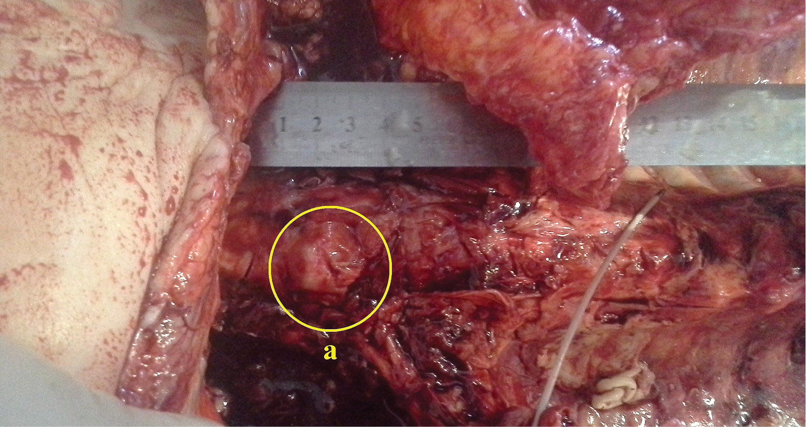 Our patient’s early post-operative period was complicated by severe pain behind the sternum not associated with acute coronary syndrome. On the 7th day after the operation, the patient died of mediastinitis, which was complicated by severe sepsis and multiple organ failure. On autopsy, the damage to the posterior wall of the esophagus occurred as a result of compression trauma against cervical and thoracic spine osteophytes during hemithyroidectomy.
