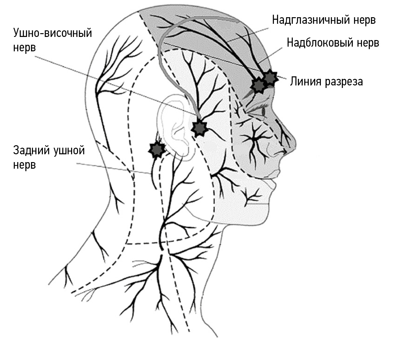 Для выполнения блокады местный анестетик вводится в проксимальных точках выхода нервов на поверхность черепа [7, 8]. Среди этих нервов – большой и малый затылочный, задний ушной, ушно-височный, скуло-височный, надблоковый и надглазничный. Регионарную анестезию целесообразно комбинировать с местной анестезией линии кожного разреза, что, конечно, увеличивает надёжность анальгетического эффекта. В соответствии с линией предполагаемого разреза блокада может включать все перечисленные ветви с обеих сторон или быть ограничена только частью дерматомов и, соответственно, точек введения анестетика. В частности, при планировании стандартного птерионального доступа к патологическому образованию достаточно заблокировать надблоковый, надглазничный, ушно-височный и задний ушной нерв со стороны операции (рис. 2). При этом наиболее важна полноценная блокада ушно-височного нерва в точке, расположенной кпереди от козелка уха, поскольку он вовлечён в иннервацию наибольшей части лоскута, включая область травматизации височной мышцы.