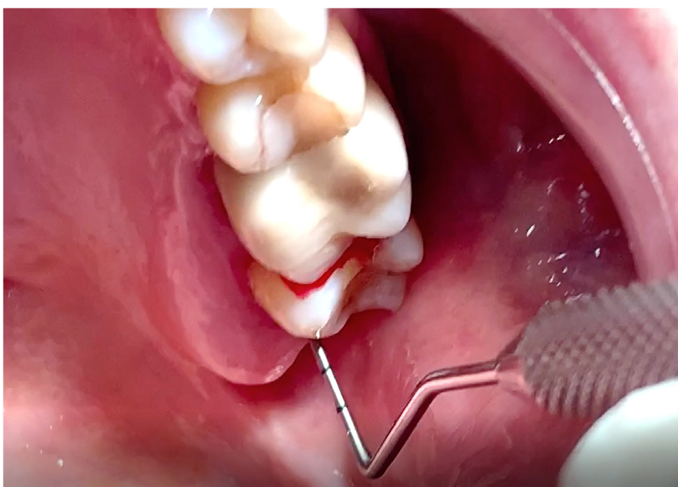 На первостепенном уровне проведена запись клинических данных («золотой стандарт»). Затем выполнена визуальная диагностика с помощью стоматологического зеркала, особо внимание уделяли скоплению зубного налета, выявление рецессии десны (рис. 3). Клинический осмотр на каждом этапе включал измерение глубины зондирования кармана и потери прикрепления (рис. 4). Сила зондирования составляла 0,20 Н, что соответствует 25 г.