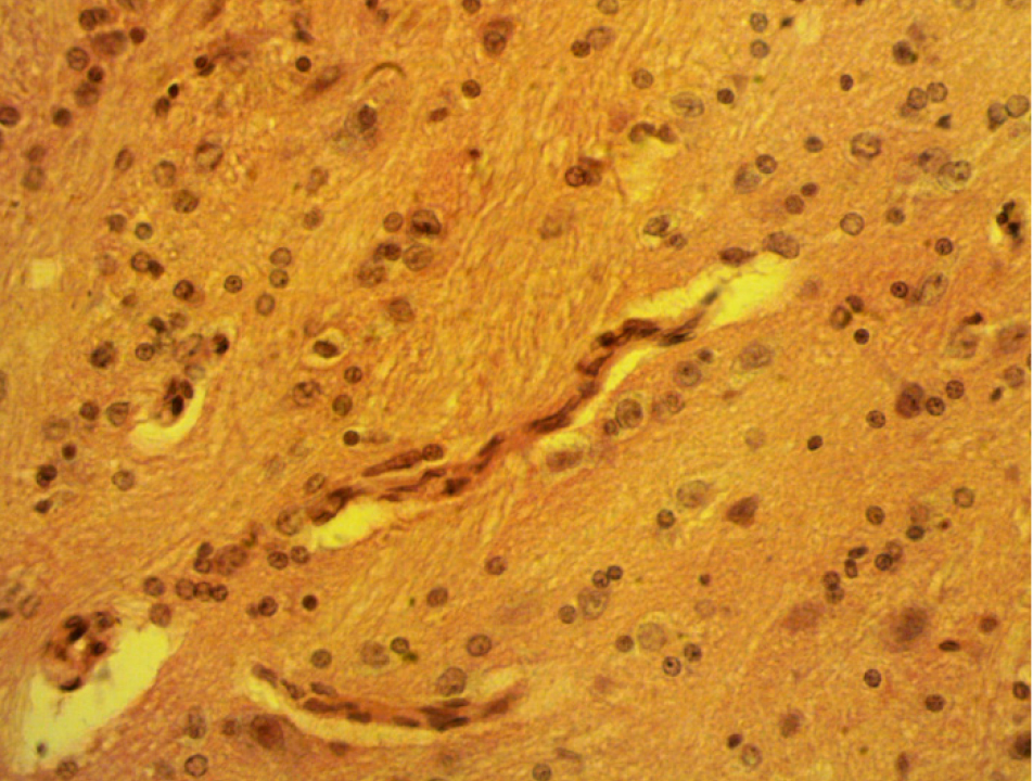 Рис. 1. Генерализованный спазм сосудов мозжечка у крыс с ЧМТ в низкогорье (гематоксилин-эозин, ув. ×400)