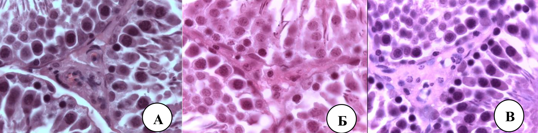 Рис. 2. Срез семенника крысы (окраска: гематоксилин и эозин, ув. ×100): А – негативный контроль, Б – позитивный контроль, В – опытная группа.