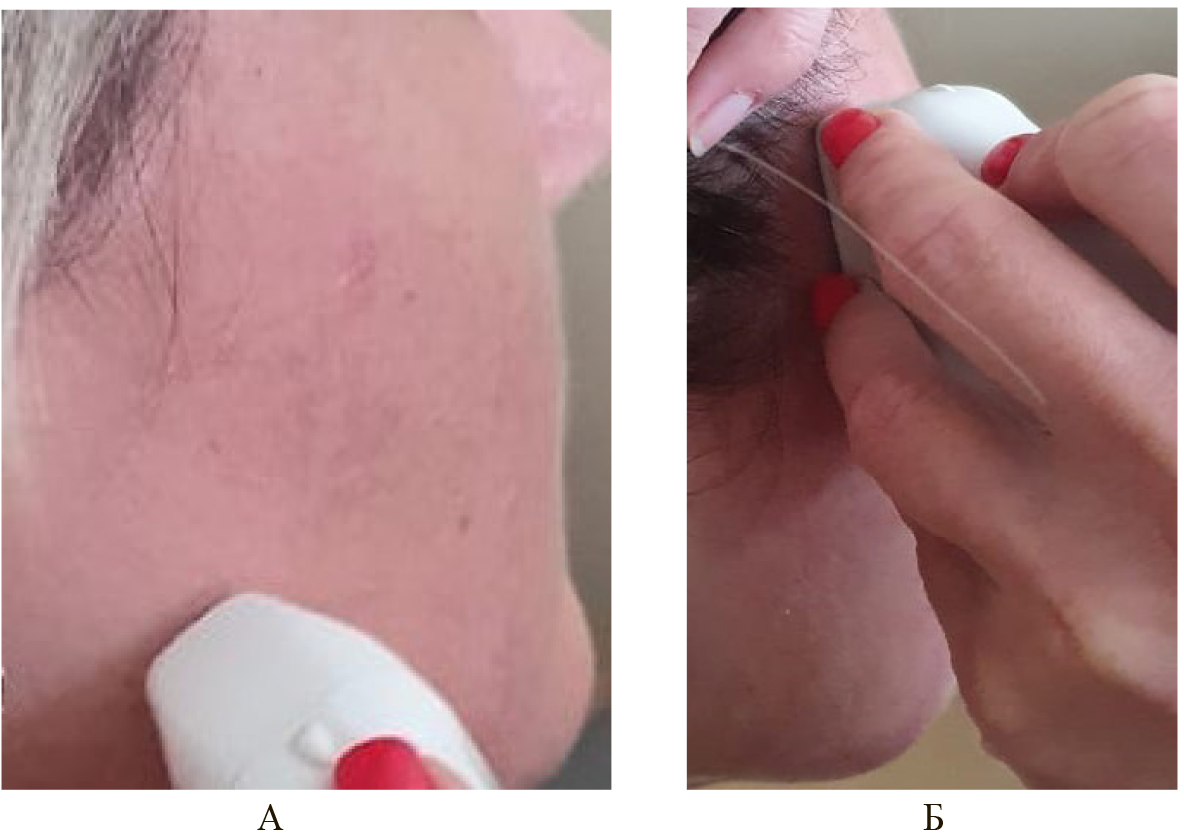 Рис. Проведение УЗИ: А – собственно жевательной мышцы, Б – височной мышцы