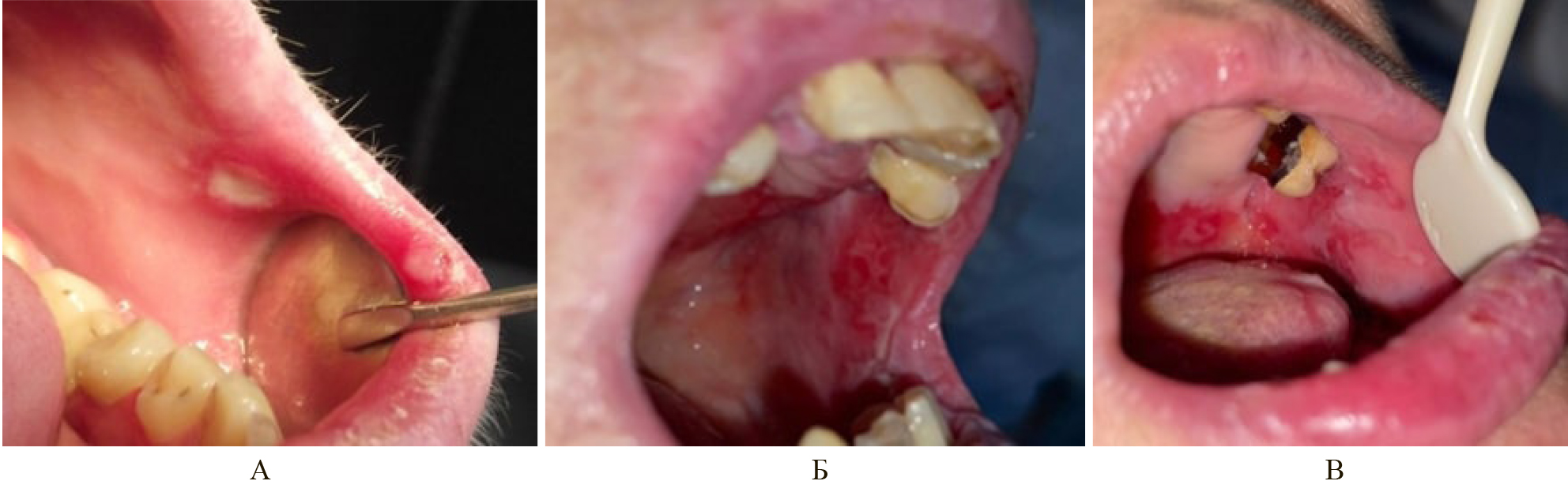 Рис. 1. Клиническая картина воспалительно-деструктивных заболеваний слизистой оболочки рта: А – хронический рецидивирующий афтозный стоматит; Б – красный плоский лишай (эрозивно-язвенная форма); В – многоформная экссудативная эритема