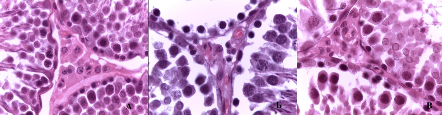 Рис. 3. Срез семенника крысы: А – негативный контроль, Б – позитивный контроль, В – опытная группа. Окраска: гематоксилин и эозин. Ув. × 100