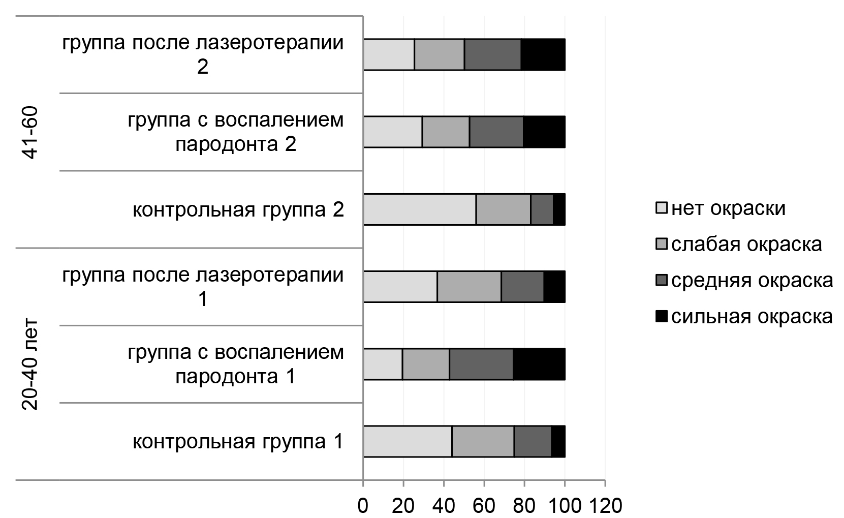 В группу I (группа молодого возраста) были включены пациенты 20–40 лет. Данная группа, в свою очередь, была разделена на следующие подгруппы: контрольная группа 1 – пациенты с клинически здоровым пародонтом; группа с воспалением пародонта 1 – пациенты с хроническим генерализованным пародонтитом легкой/средней степени тяжести; группа после лазеротерапии 1 – пациенты с хроническим генерализованным пародонтитом после терапии диодным лазером.