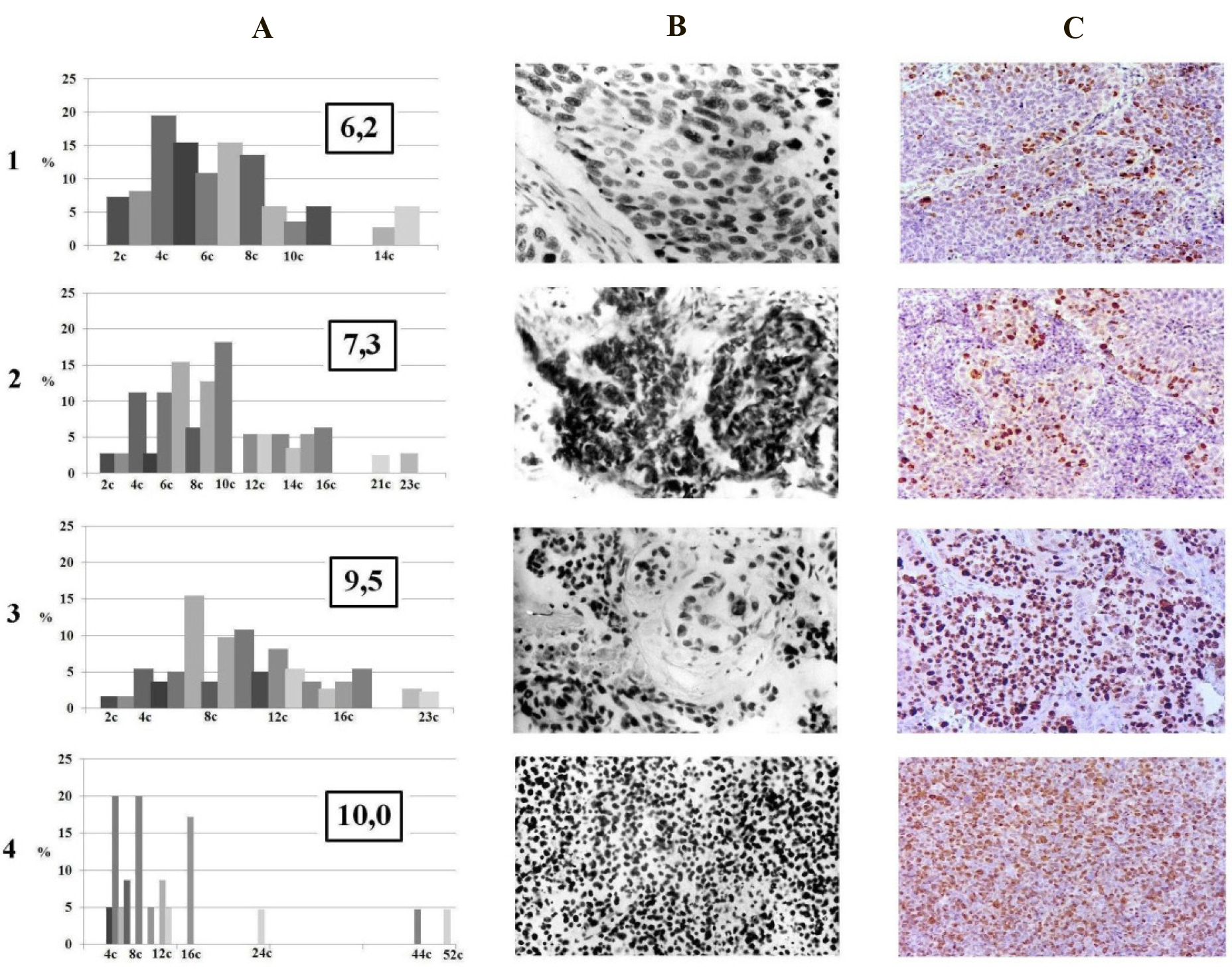 Рис. Содержание ДНК в ядрах клеток злокачественных опухолей легкого с различной степенью дифференцировки (микроспектрофотометрическое исследование) и иммуногистохимическая экспрессия фактора клеточной пролиферации Ki-67: 1 – неороговевающая плоскоклеточная карцинома; 2 – базалоидная плоскоклеточная карцинома; 3 – солидная аденокарцинома; 4 – нейроэндокринная мелкоклеточная карцинома. A – ИН ДНК, по оси ординат – количество клеток (%), по оси абсцисс – значения плоидности (с); B – реакция Фельгена, ×400; C – экспрессия Ki-67, иммунопероскидазная реакция с DAB, ×400