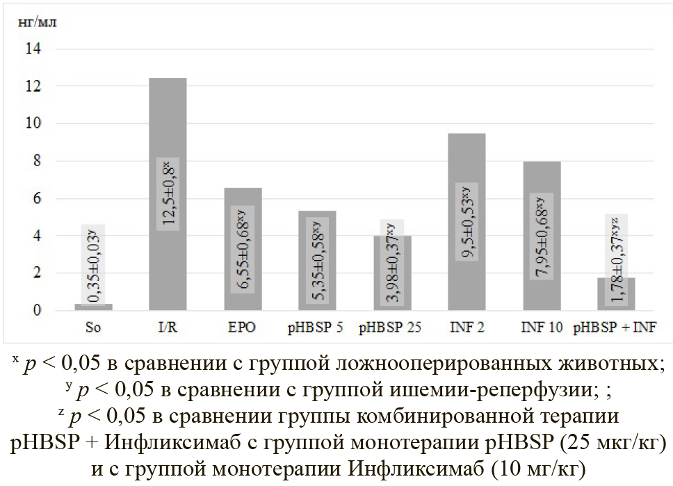 - Ишемия/реперфузия + пептид, имитирующий альфа-спираль эритропоэтина бета (pHBSP), 25 мкг/кг внутрибрюшинно за 30 мин до моделирования ишемии + Инфликсимаб [Remicade®, MSD Ireland (Brinney)] 10 мг/кг внутрибрюшинно за 1 ч до моделирования ишемии.