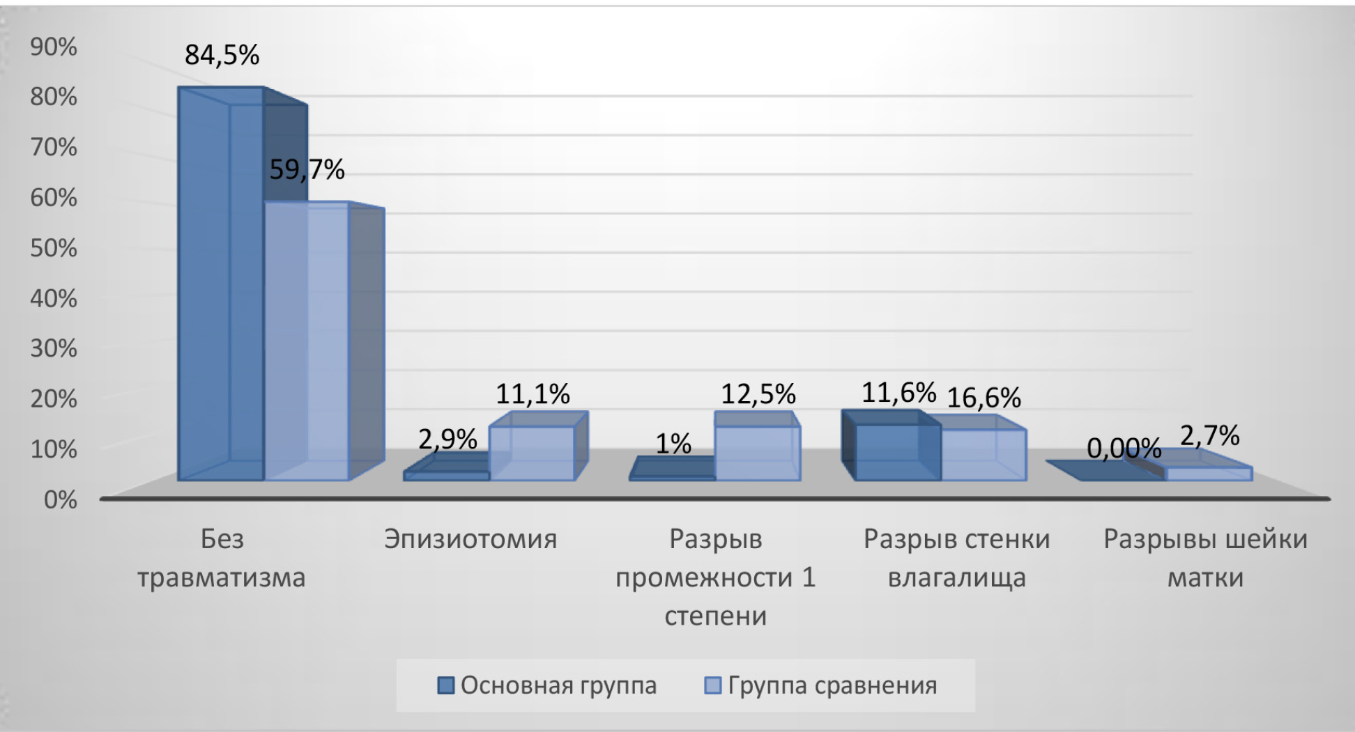 Травмы промежности тяжелой степени в обеих группах отсутствовали. В основной группе родовой травматизм удалось избежать у 87 (84,5 %) пациенток, эпизиотомия выполнена у 3 (2,9 %), у 1 (1 %) произошел разрыв промежности 1-й степени и у 12 (11,6 %) женщин – разрыв стенки влагалища. В группе сравнения отсутствие родового травматизма отмечено у 43 (59,7 %) родильниц (χ2 = 12,9, р < 0,001; ОР 2,6 95%-й ДИ 1,5; 4,5), эпизиотомия выполнена у 8 (11,1 %) (χ2 = 6,8, р = 0,01; ОР 5,8 95%-й ДИ 1,2; 26,5), разрывы промежности у 9 (12,5 %) (χ2 = 7,1, р = 0,008; ОР 11,6 95%-й ДИ 1,4; 91,0) и разрывы стенки влагалища у 12 (16,6 %) (χ2 = 0,55, р > 0,05) родильниц. У двух родильниц из группы сравнения вместе с разрывом промежности отмечался и разрыв шейки матки 1-й степени. Тем самым показано, что статистически значимые показатели были получены только относительно разрывов промежности и отсутствовали в случае разрывов стенок влагалища (рис.).